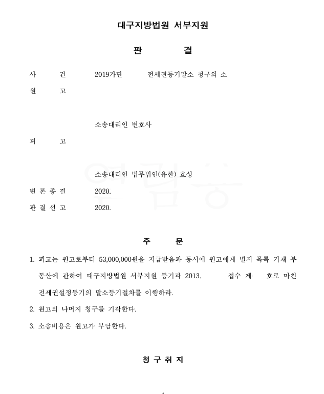 저는 즉각 응소하여 전세금이 존재하다고 주장 입증하였고 법원은 저희의 주장을 받아들여 전부 승소 판결을 선고하였습니다.