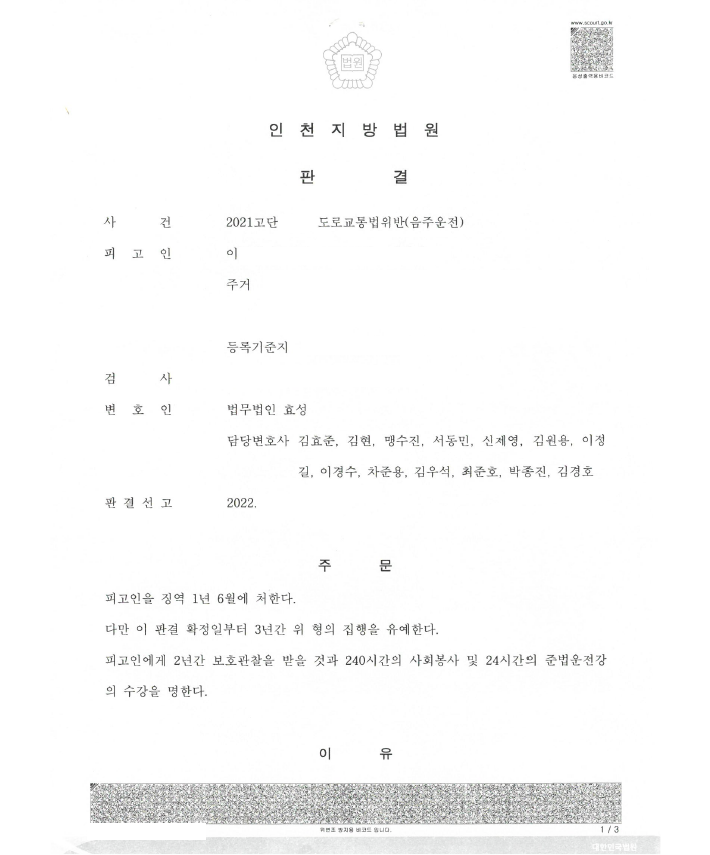 의뢰인은 이미 집행유예를 포함한 3번의 음주운전 전과가 있는 상태에서 또 다시 음주운전을 하여 적발되었고 즉시 저에게 의뢰하였습니다.