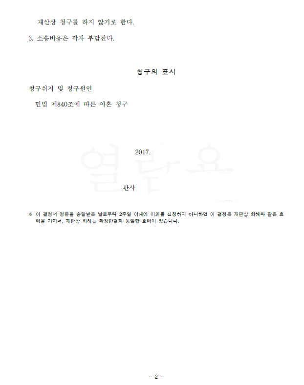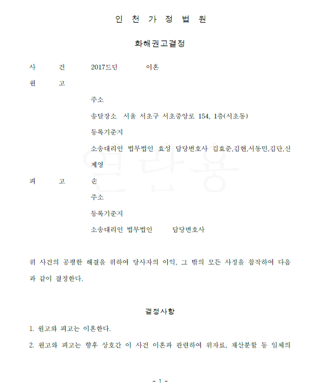 저는 즉각 재판상 이혼 소송을 제기하고 상대방의 악의의 유기, 심히 부당한 대우 등 이혼사유를 주장 입증하였습니다. 이에 법원은 원고와 피고가 이혼하라는 화해권고결정을 내렸고 이의 없이 확정되어 의뢰인은 이혼할 수 있게 되었습니다.