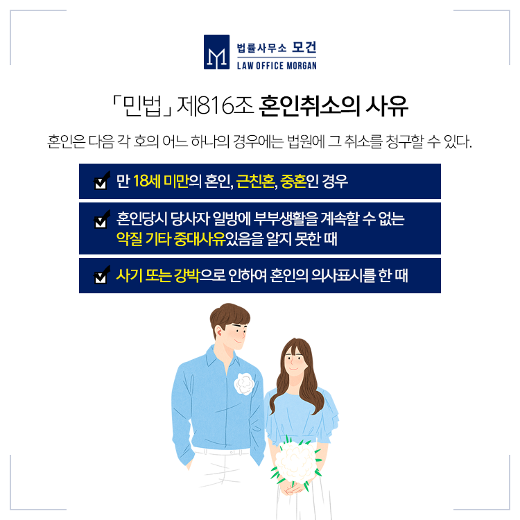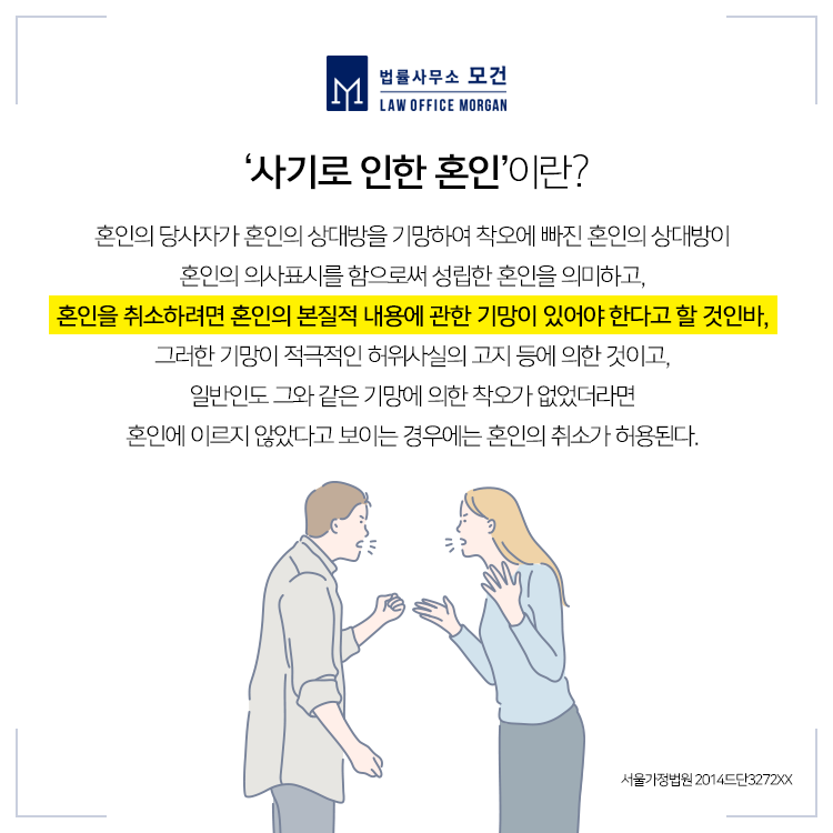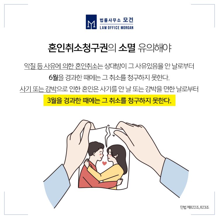 이처럼 혼인취소를 위해서는 민법에서 정한 혼인취소사유를 입증할 수 있어야 하고, 사기에 의한 혼인취소는 3개월 이내, 악질 등 사유에 의한 혼인취소는 6개월 이내에 소를 제기하여야 합니다. 실제로 혼인취소를 결심하고 변호사를 통해 소를 제기하기까지의 시간이 넉넉하지 않기 때문에 보다 신속한 대응이 중요한데요. 그런만큼 유사소송에 풍부한 경험을 보유한 변호사의 도움을 받으시는 것이 유리합니다.