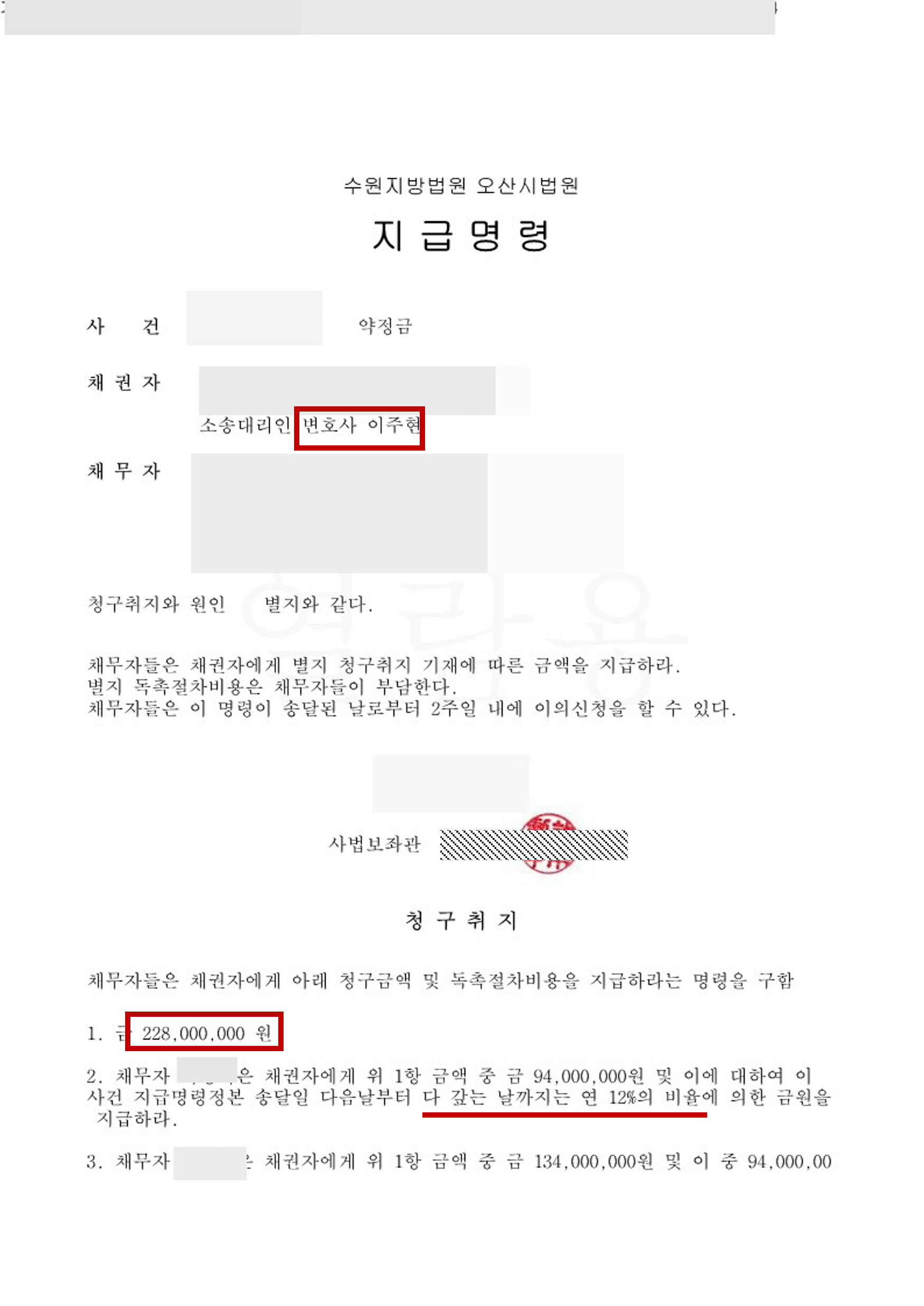 소송까지는 짧은 시간 내에 해결할 수 있었으나, 채무자들의 재산 파악 등 추심과 관련하여 많은 시간과 노력이 필요한 사건이었고, 본 사무소에서 할 수 있는 모든 절차를 진행하였던 사건으로 결국 채권 전액을 회수할 수 있었기에 성공적인 사례로 평가합니다.