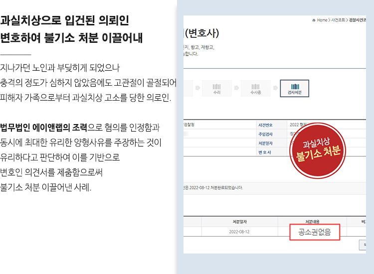 실치상의 경우 피해자와 합의하면 공소권 없음 처분을 받을 수 있으므로, 합리적인 선에서 합의를 도출하기 위하여 검찰에 형사조정 신청 형사조정 절차를 통해서 피해자와 합리적인 금액으로 민사 포함 합의를 도출하여 향후 민사소송의 여지를 없앰으로써 좋은 결과를 이끌어낼 수 있었습니다.