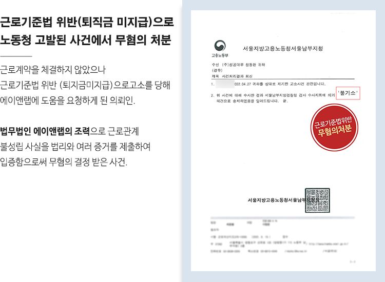 서울지방고용노동청 서울남부지청은 신상민 변호사의 의견을 인정하고 불기소 의견으로 송치하였습니다.