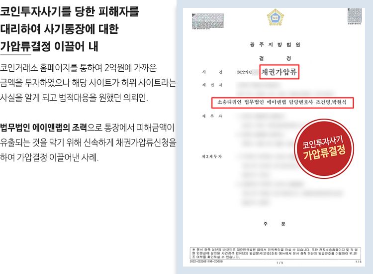 코인투자사기에 있어 가장 중요한 것은 더 큰 피해를 막기 위해 신속하게 채권가압류신청을 해야 하는 것입니다. 조건명, 김현정 변호사의 빠른 판단으로 신속하게 대응할 수 있었기에 의뢰인은 금원을 보장받을 수 있었던 사례입니다.