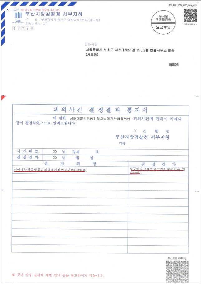 의뢰인님께서는 최근 성매매 처벌 수위에 비추어 벌금형이 선고될 위험이 높은 상황이었습니다. 그러나 앞서 말씀드린 다양한 방법으로 경찰, 검찰 수사 단계를 신중히 진행하였고 이에 부산지방검찰청 서부지청은 의뢰인님에게 "기소유예"처분을 내렸습니다.