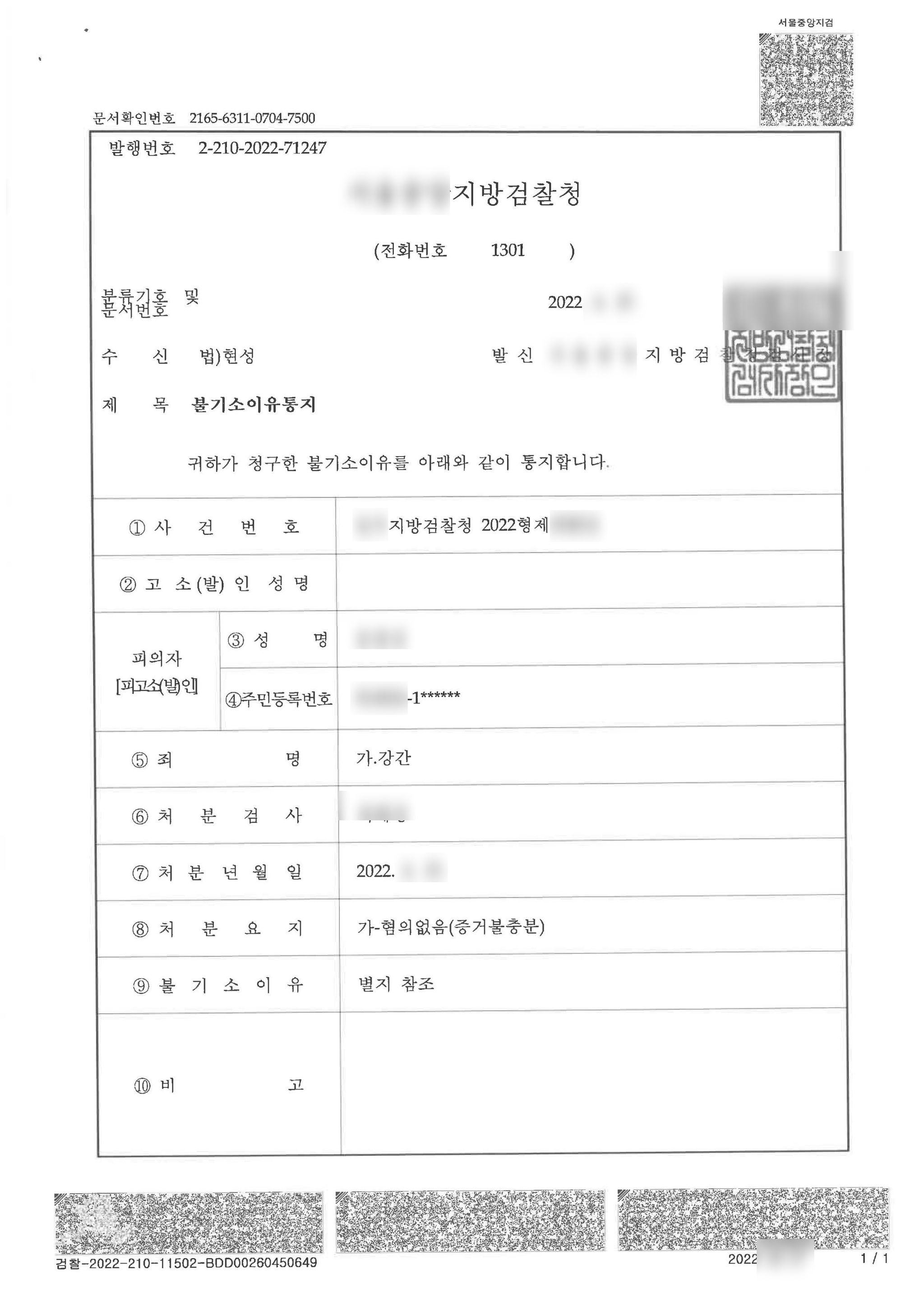 검찰의 불기소처분(혐의없음)을 받았습니다.