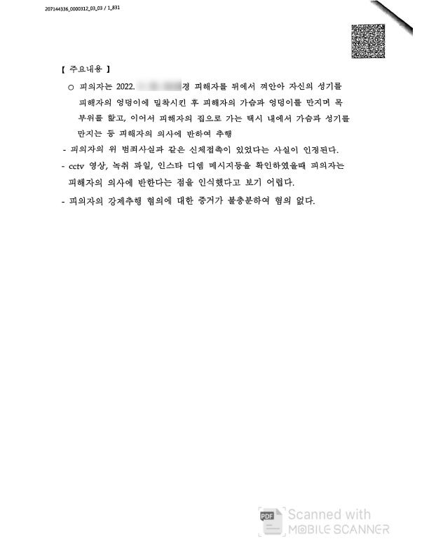 『피의자는 2022. 00. 00.경 피해자를 뒤에서 껴안아 자신의 성기를 피해자의 엉덩이에 밀착시킨 후 피해자의 가슴과 엉덩이를 만지며 목부위를 핥고, 이어서 피해자의 집으로 가는 택시 내에서 가슴과 성기를 만지는 등 피해자의 의사에 반하여 추행하였다』