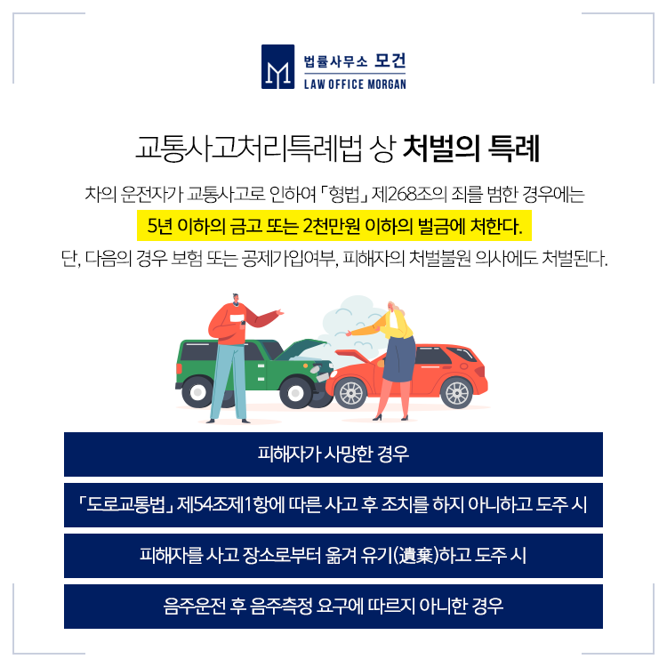 운전자의 과실로 교통사고가 발생하였고, 이로인해 피해자가 사망하게 된 경우에는 교통사고처리특례법 위반 혐의가 적용되며 5년 이하의 금고 또는 2천만원 이하의 벌금으로 처벌됩니다. 교통사고처리특례법에서는 업무상과실치상 또는 중과실치상죄를 범한 운전자에게는 특례의 조항이 있어 보험 또는 공제에 가입되어 있거나, 피해자가 처벌을 원하지 않으면 처벌을 면하게 해주지만, 피해자의 사망사고에 대해서는 특례의 조항이 적용되지 않습니다.