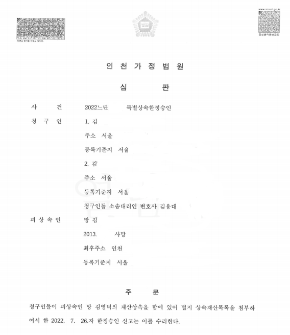 그 후 본 법률사무소는 A와 B가 X의 채무초과 사실 자체를 알지 못했다는 것을 소명함으로써 결국 법원으로부터 특별한정승인 수리 결정을 받았고, 그 사이에 변론이 추정되어 있던 위 양수금 청구소송이 진행되고 있는 법원에 위 특별한정승인 수리 결정문과 준비서면을 제출함으로써 사건을 원만히 해결할 수 있었습니다.