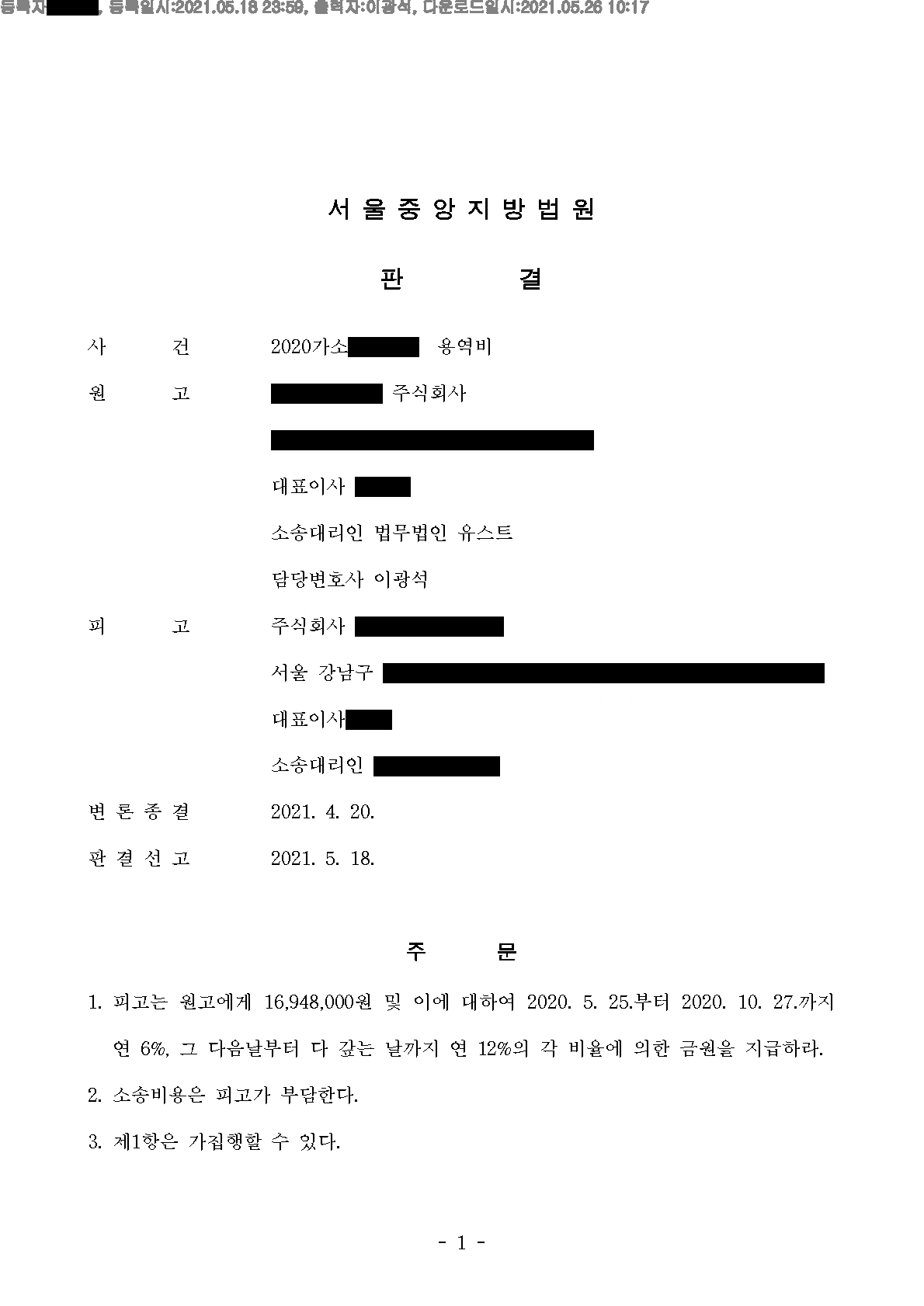 원고의 의뢰를 받고 용역비를 지급받기 위해 소를 제기하였습니다. 원고의 대리인은 "회사가 지입된 차량은 대외적으로 그 회사의 소유이고 지입차주는 수탁관리운영계약 등에 의하여 위 회사로부터 당해차량의 운행관리권을 위임받아 통상업무에 속하는 차량의 운행관리를 대리하고 있다면 지입차주가 그 차량들을 수리받거나 차량부속품을 구입한 행위는 차량관리의 통상업무에 속하는 것으로서 위 회사를 대리한 행위라 할 것이어서, 자동차부속상들이 그 수리비 및 부속품 대금을 지입차주측에게만 청구하기로 약정하였다는 등 특별한 사정이 없다면 위 회사로서는 그 수리비 및 부속품대금의 지급책임을 면할 수 없다." 대법원 1987. 5. 26. 선고 86다카2677판결 등을 변론하여 전부 승소하였습니다.