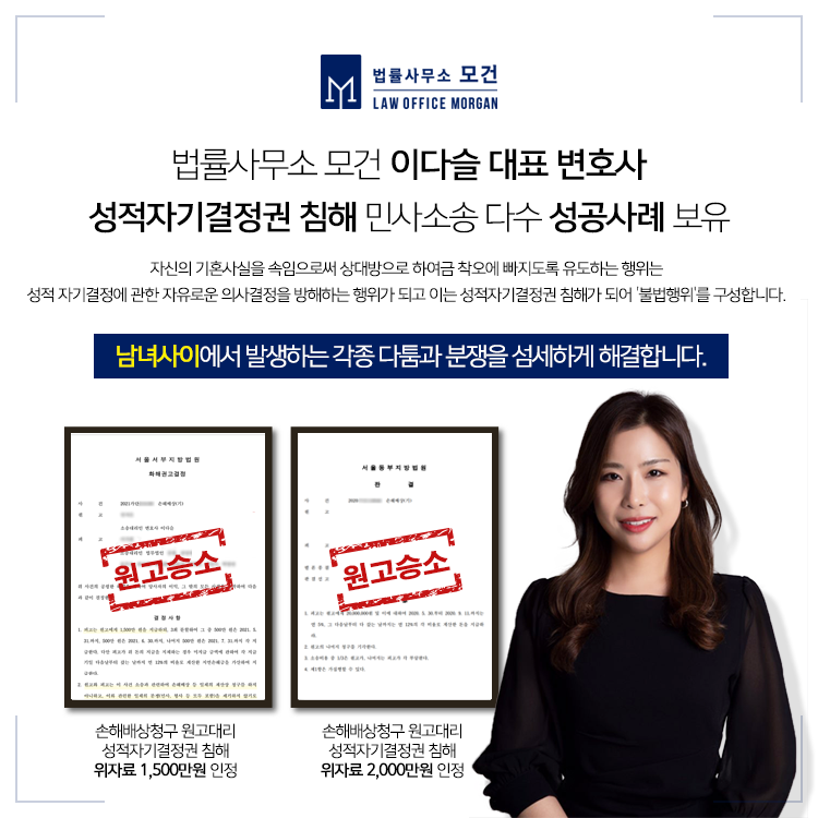 법률사무소 모건의 이다슬 대표 변호사는 위와같은 성적자기결정권침해 관련 사건에서 위자료를 이끌어 낸 성공사례를 보유하고 있습니다. 여성변호사로서 의뢰인분들의 마음을 깊이 헤아리며 사건에 임하고 있으며, 데이트폭력, 금전편취, 리벤지포르노 등 형사사건에도 긴밀한 조력을 제공합니다. 상담이 필요하신 분들은 법률사무소 모건으로 문의하시기 바랍니다.