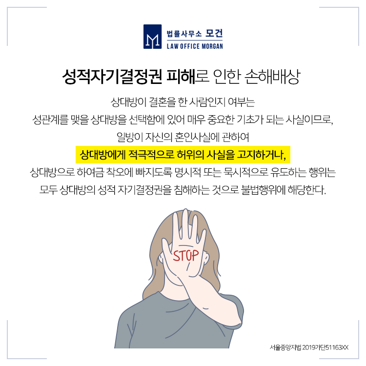 성적자기결정권이란, 다른 사람으로부터 부당한 간섭을 받지 아니하고 자신의 자유로운 의사에 기하여 상대방을 선택하고 성관계를 가질 권리를 의미하는데요. 상대방의 혼인 유무는 성관계를 맺을 상대방을 선택함에 있어 매우 중요한 요인이 되는데, 이를 속임으로써 성관계에 나아가도록 한 경우에는 법적으로 용인되는 정도를 넘는다고 보는 것입니다. 만약 교제를 넘어 금전편취까지 이루어졌다면 상대방을 형사고소 할 수도 있으므로 관련사건에 경험많은 변호사의 도움을 받으시기 바랍니다.