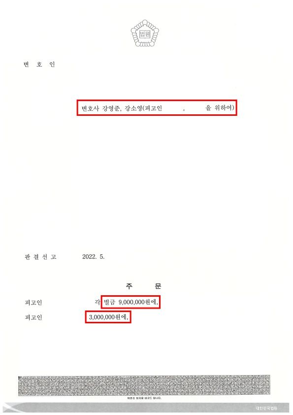 그 결과 울산지방법원에서는 중간 간부인 의뢰인님 A에게는 벌금 900만 원, 부하직원에 불과한 의뢰인님 B에게는 벌금 300만 원이라는 관대한 처분을 내렸습니다.