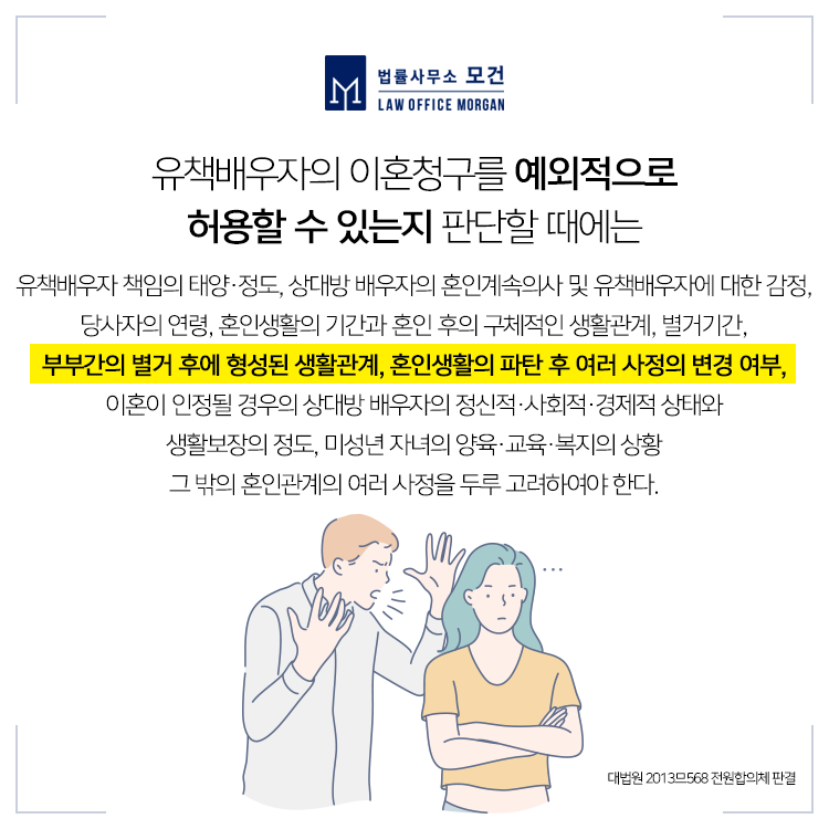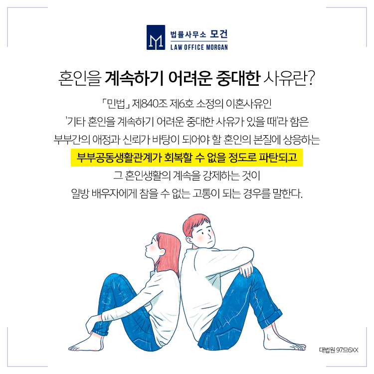이처럼 상대방이 이혼을 강력히 거부하고 있는 경우라면, 법원에서 인정하는 이혼사유를 충족하거나, 유책배우자라 하더라도 받아들여질 수 있는 예외의 사유를 충족하여야 합니다. 법원은 「민법」 제840조 제6호 '기타 혼인을 계속하기 어려운 중대한 사유가 있을 때' 이혼을 인용하고 있는데요. 이경우 혼인의 계속을 강제할 시 일방에게 참을 수 없는 고통이 되어야 할 정도의 사유가 있어야 한다고 보고 있는데요.