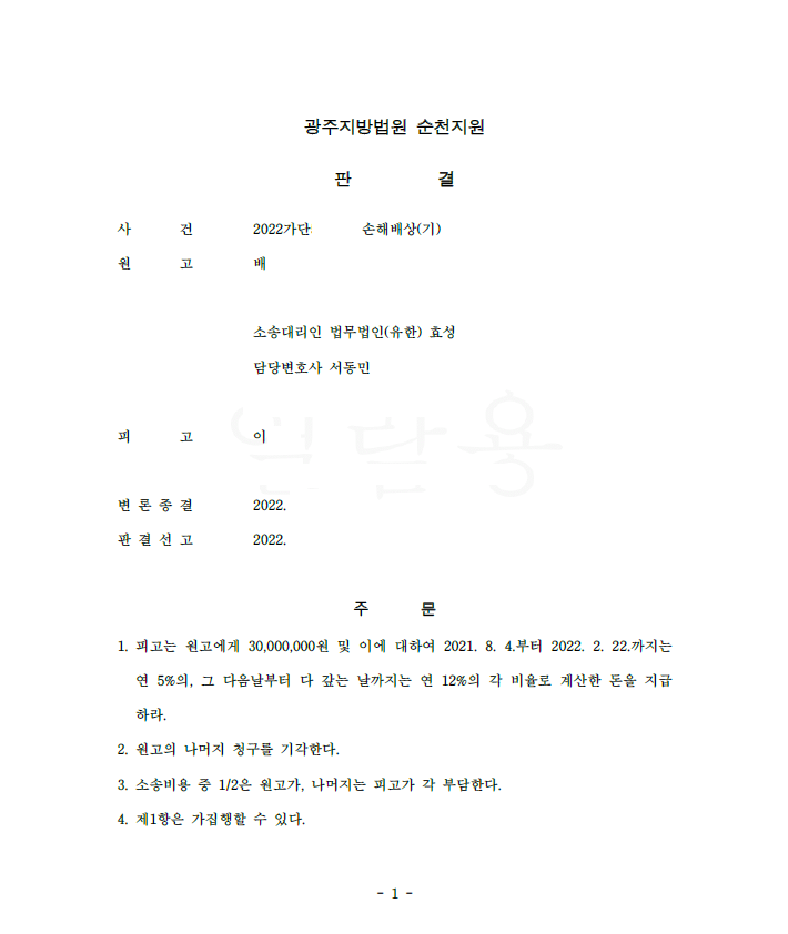 저는 즉각 피고를 상대로 민사소송을 제기하면서 피고의 위 불법행위로 원고의 입금액에 상응하는 손해가 발생하였다며 손해배상 청구를 하였고 법원은 저희의 주장을 받아들여 승소 판결을 선고하였습니다. 의뢰인은 이로써 피해액을 반환받게 되었습니다.