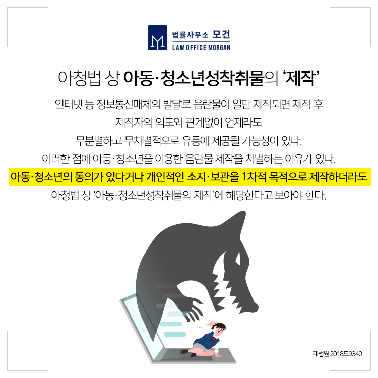 이처럼 음란물제작죄는 본인이 직접 촬영하지 않더라도, 본인이 지시하였다면 제작이라 보고 있으며 「청소년성보호법」에 의해 무기징역 또는 5년 이상의 유기징역에 처하는 범죄입니다. 또한 수사 당시에는 미성년자라 하더라도 판결선고 당시에 성인이 되었다면 「소년법」이 아닌 「형법」이 적용되게 되는데요. 다만, 아직 성적가치관이 정립되지 않은 미성년자일 시기에 저지른 범죄인 점 등이 참작될 수 있도록 미성년 형사사건에 경험많은 변호사의 도움하에 사건에 임하는 것이 유리합니다.