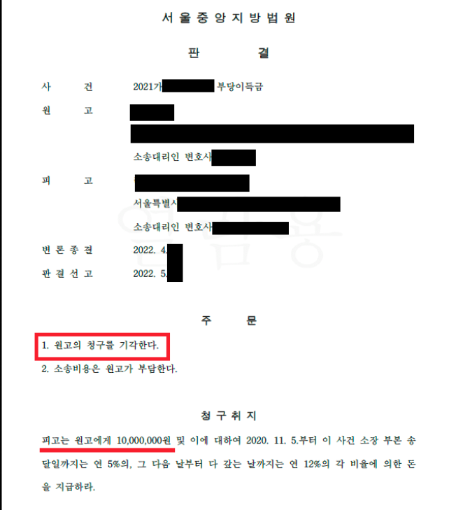 1심 법원은 최광희 변호사의 주장을 그대로 인용하여 원고의 청구를 전부기각하고, 피고에게 전부승소 판결을 선고하였습니다. 보이스피싱 사건의 경우 법원은 통상 보이스피싱 피해자에게 유리한 판결을 내리는 경향이 있고, 사정이야 어쨌든 피고가 결과적으로 보이스피싱범이 중국으로 돈을 쉽게 빼낼 수 있게 기여한 것은 사실이기 때문에, 과연 전부승소를 받아낼 수 있을지 문제가 있었으나, 최광희 변호사의 부당이득반환청구, 불법행위 관한청구에 대한 적극적인 논증 및 변론으로 피고가 전부승소판결을 받아낼 수 있었습니다.