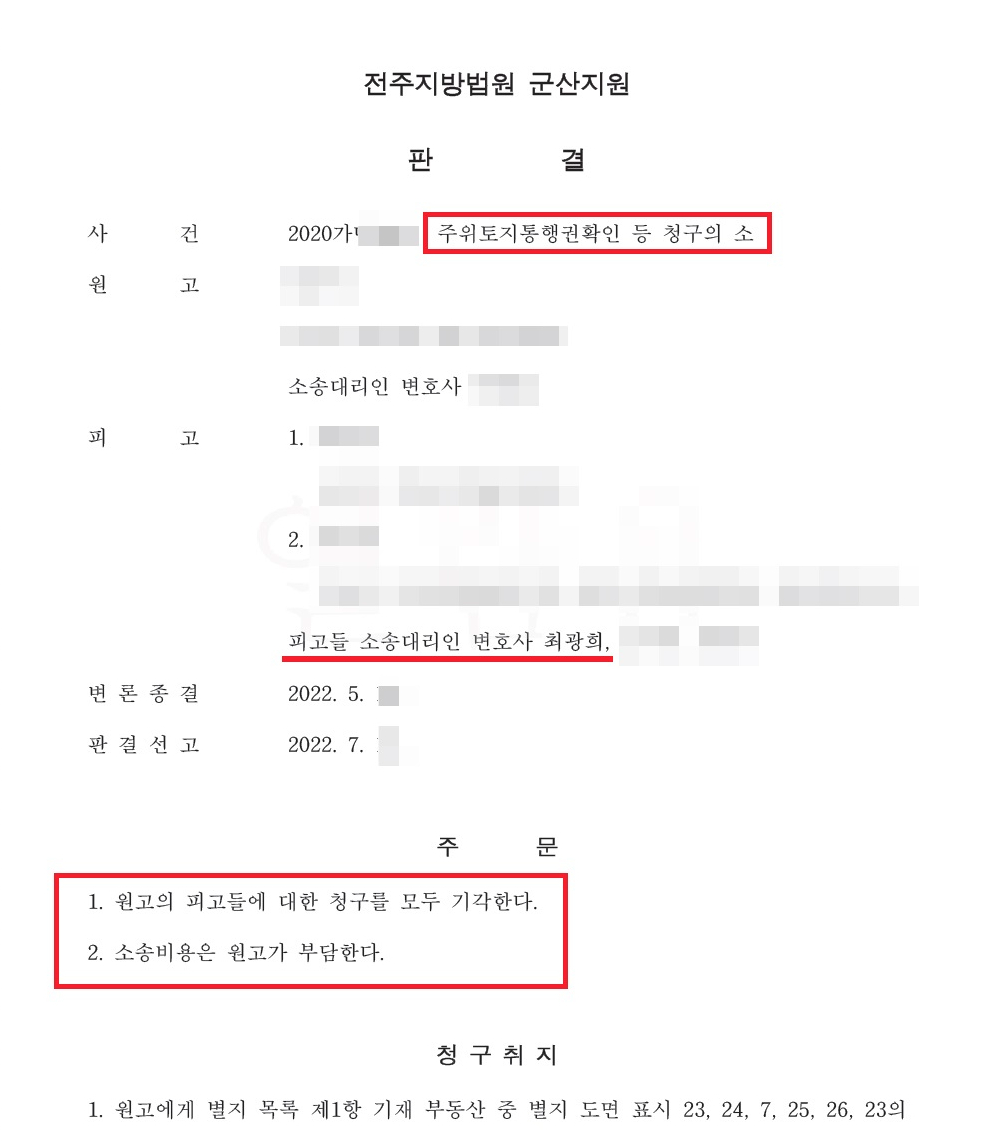 1심 법원은 최광희 변호사가 언급한 판례를 판결문에 그대로 기재하면서 이 사건 토지의 통행로에 차량 통행을 허용할 경우 이 사건 토지는 사실상 반으로 쪼개지는 결과가 되고, 차량 통행을 위해 3미터 가량의 길을 내는 경우 피고가 지켜온 효열비를 훼손하게 되는 등 손해가 막심한 반면, 원고는 고작 이 사건 토지에 차량의 통행을 허용하지 않더라도 원고는 고작 30미터 가량을 걸어서 올라가는 것이 불과하여 원고의 불편이 크지 않다고 판단하여 원고의 주위토지통행권 확인청구 및 손해배상 청구를 전부 기각하였습니다.
