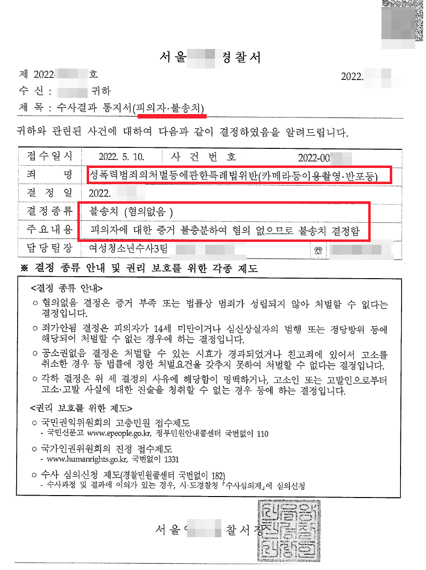 3. 카메라촬영죄 불송치(무혐의) 결정
