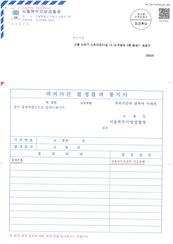 ※ 이에 서울북부지방검찰청은 "기소유예" 처분을 하여 의뢰인님께서는 아무런 전과기록도 남지 않은 사건입니다.