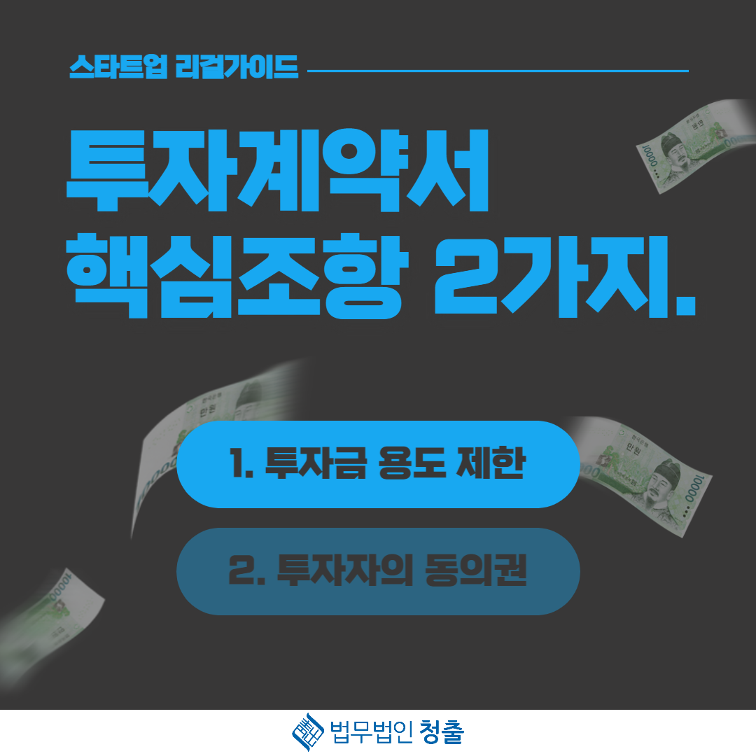 과연 '투자금의 용도제한 위반'과 '투자자의 동의권 침해'가 무엇인지, 위반한 경우에는 어떤 일들이 발생하는지, 그렇다면 어떤 점을 주의하고 계약해야 하는지를 차례로 알아보도록 하겠습니다.