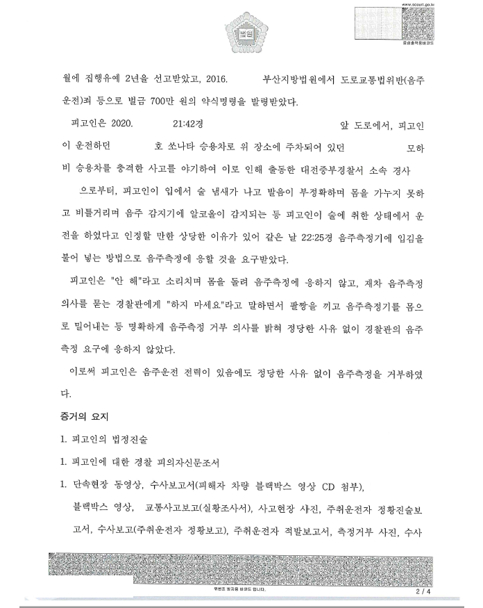 의뢰인은 이미 2회 음주운전 전과가 있는 상태에서 차량을 충격한 후 신고를 받고 출동한 경찰관의 음주측정요구를 거부하여 입건되었습니다.