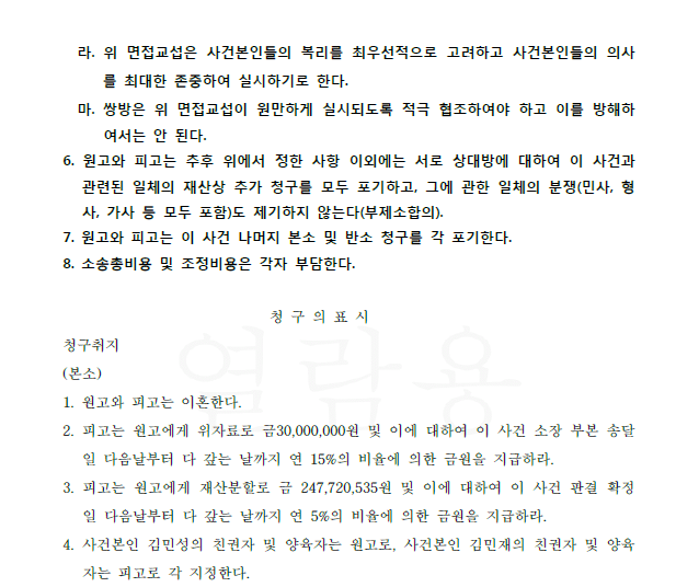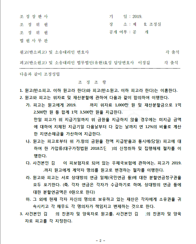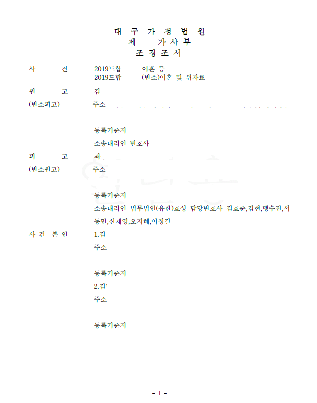 저는 즉각 답변서 및 반소장을 제출하면서 이혼의사의 합치는 있으나 상대방이 주장하는 재산분할 및 위자료가 근거가 없어 이유 없다고 주장 입증하였고, 조정에서 판사는 저희의 주장을 받아들여 재산분할과 위자료를 모두 1/2 이상 감액한 조정안을 내놓아 조정이 성립하였습니다.
