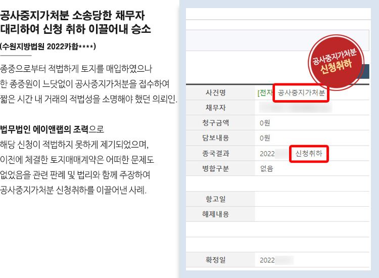 의뢰인(채무자)은 종중과 적법하게 거래한 것으로 알고 있었는데, 새로운 종중 대표자에 대해 불만을 자주 제기해왔던 종중원이 공사중지가처분을 접수하였고, 의뢰인은 짧은 시간 내에 거래의 적법성을 소명해야 하는 처지에 처하게 되었고, 법무법인 에이앤랩에 도움을 청하였습니다.