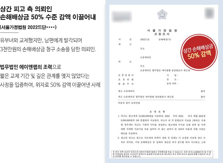 또한 원고 측과 별도의 협의를 통해 위자료 감액과 분납에 대한 협의를 진행하였습니다.