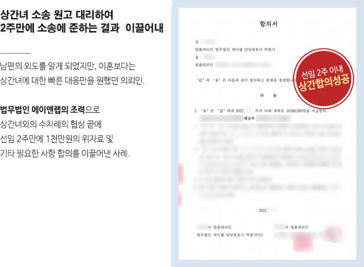 이에 박현식 변호사는 상간녀와의 합의를 통해 사건을 마무리하는 전략을 세우고, 상간녀와 수차례의 협의를 진행하였고, 협의를 시작한지 2주도 채 되지 않아 의뢰인이 원하는 바가 담긴 합의를 이끌어 낼 수 있게 되었습니다.