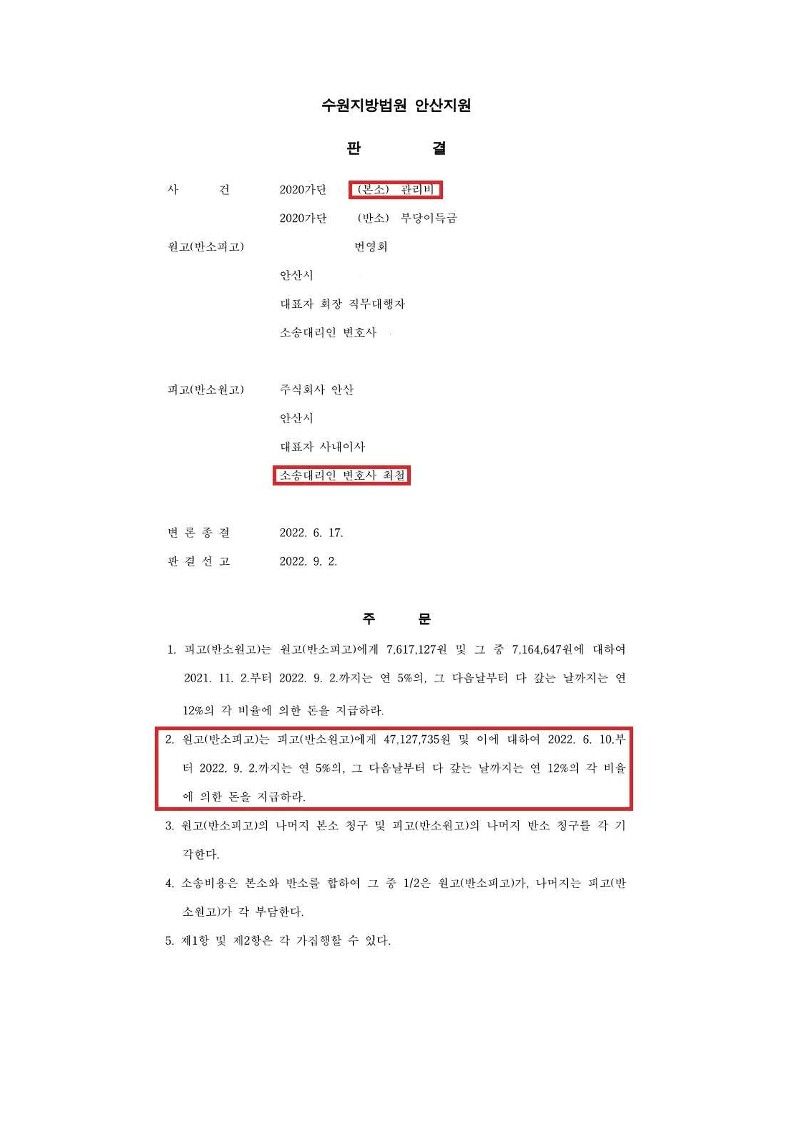 이에 변호인은 관리비 부과의 법적 근거가 없고, 관리비 부과 기준 중 면적이 실제와 다르다는 점을 주장하여 적지 않은 금액의 관리비를 부당이득금으로 반환받게 되었습니다.