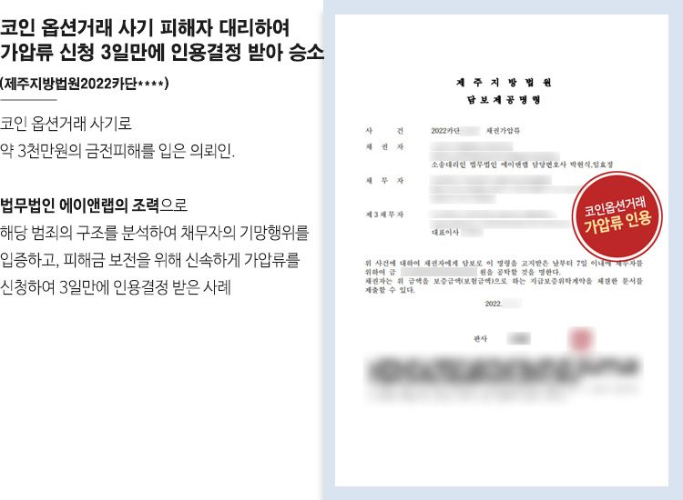 코인 사기와 같이 가상자산 사기 사건은 피해 발생 이후 빠르게 가압류를 신청하여 피해금을 보전시키는 것이 핵심입니다. 이와 같은 절차는 개인이 스스로 진행하는 것은 매우 어렵고 복잡하기 때문에 관련 경험이 풍부한 에이앤랩의 조력을 받아 진행한다면 더욱 빠르고 확실한 결과를 만들 수 있을 것입니다.