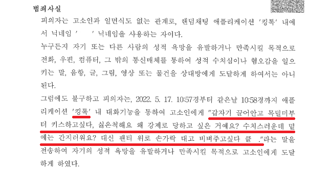 A씨는 2022. 5. 17. 10:57경 여느 때와 마찬가지로 '킹톡'을 하던 중 전혀 모르는 여성 B씨에게 다짜고짜 "갑자기 끌어안고 목덜미부터 키스하고싶다. 싫은척해요 왜 강제로 당하고 싶은 거에요? 수치스러운데 밑에는 간지러워요? 대신 팬티 위로 손가락 대고 비벼주고싶다 클○."라는 성적 채팅을 전송하였습니다.