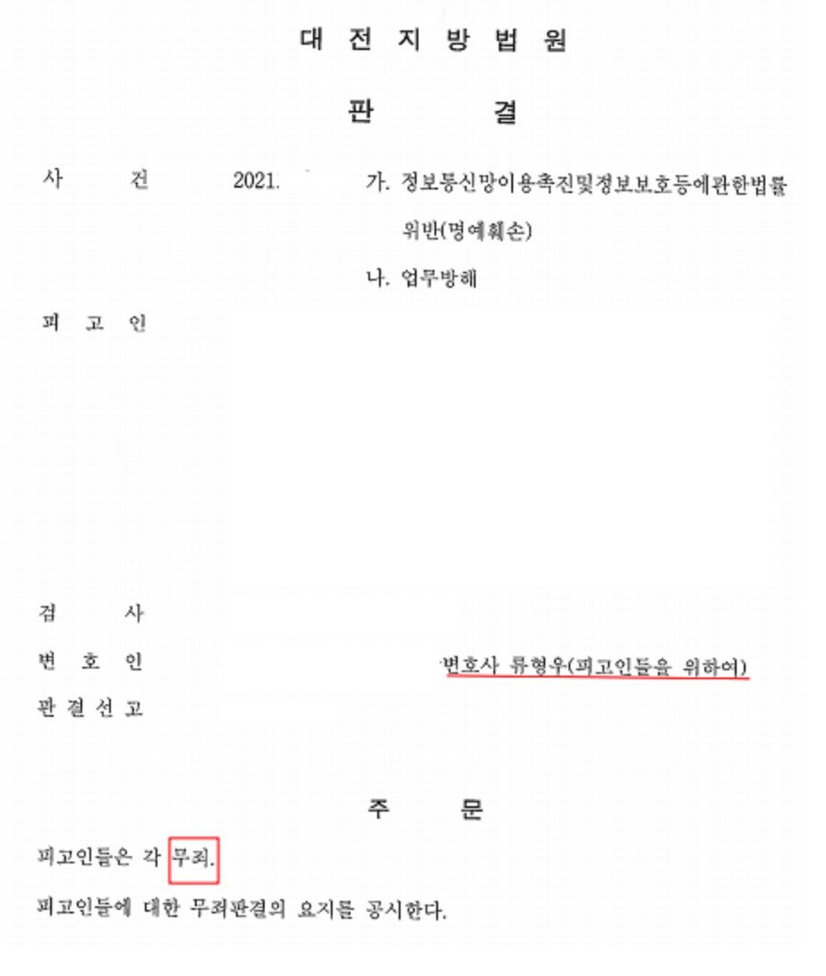 재판부는 본 변호인의 주장을 받아들여 의뢰인에 대한 정보통신망법위반(명예훼손)의 점에 대하여 무죄를 선고하였습니다.