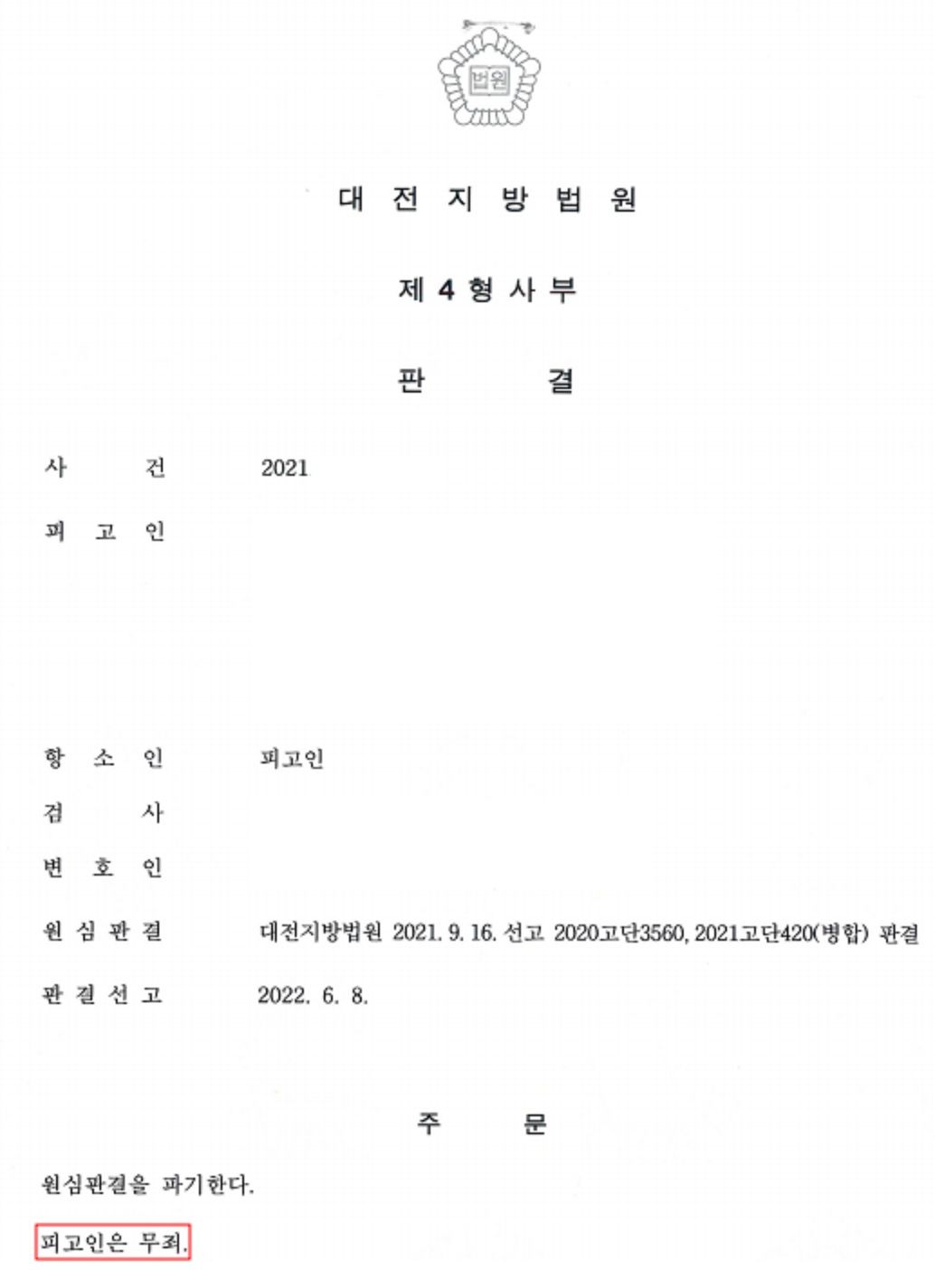 재판부는 본 변호인의 주장을 받아들여 의뢰인에 대한 사기죄의 점에 대하여 무죄를 선고하였고, 이후 상고심에서도 무죄가 유지된바, 최종적으로 의뢰인의 혐의에 대하여 무죄가 확정되었습니다.