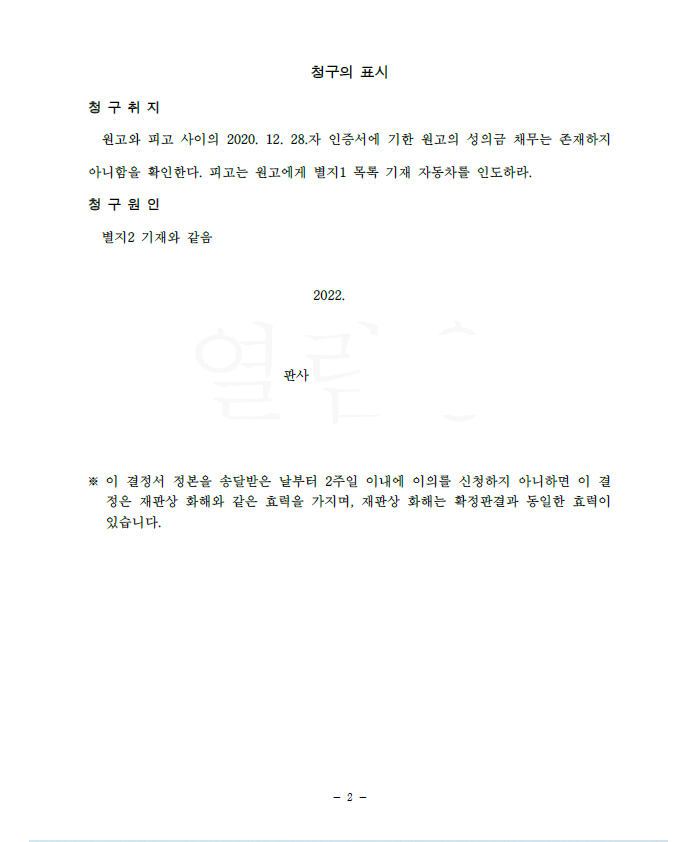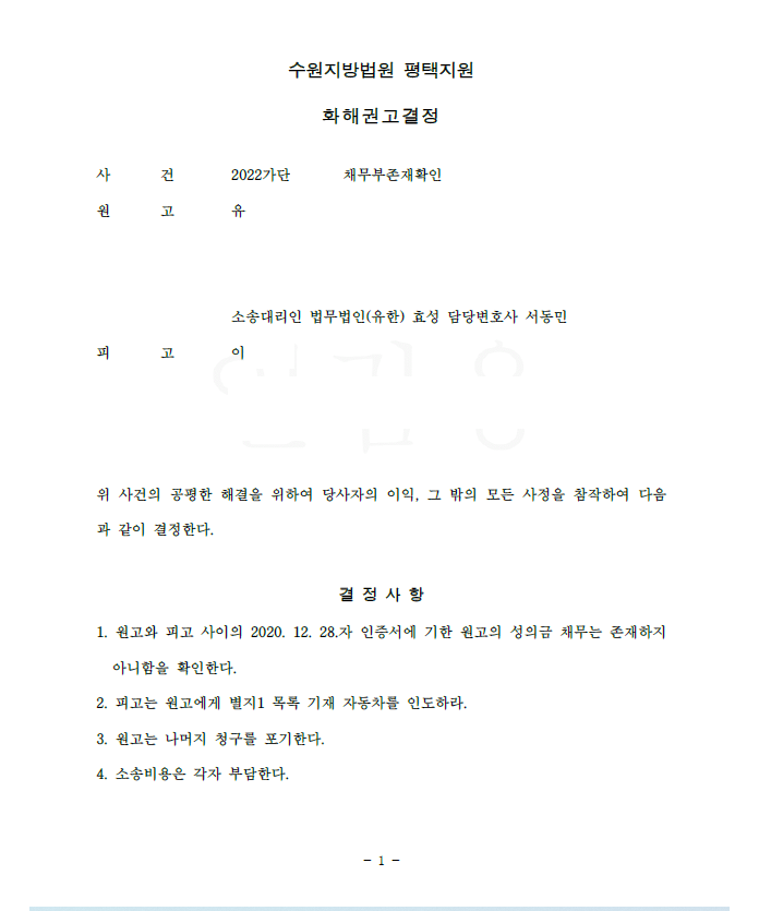 저는 즉각 피고를 상대로 채무부존재확인 및 차량인도청구를 하였고 피고는 소장을 받고 저희의 주장을 모두 받아들이기로 하여 원고 전부 승소 취지의 화해권고결정이 내려져 확정되어 의뢰인은 채무부존재확인을 받고 차량을 회수하였습니다.