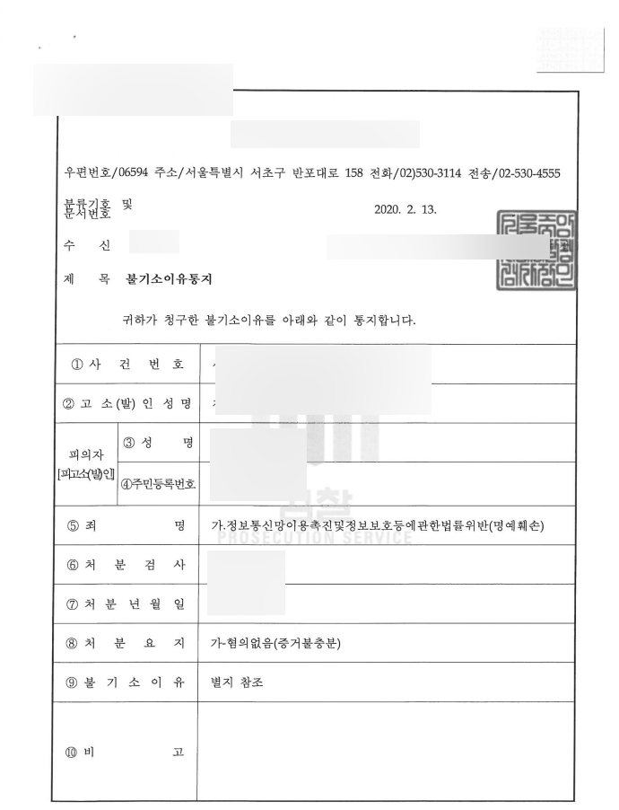 범죄 인정되지 아니하여 불기소 의견임.