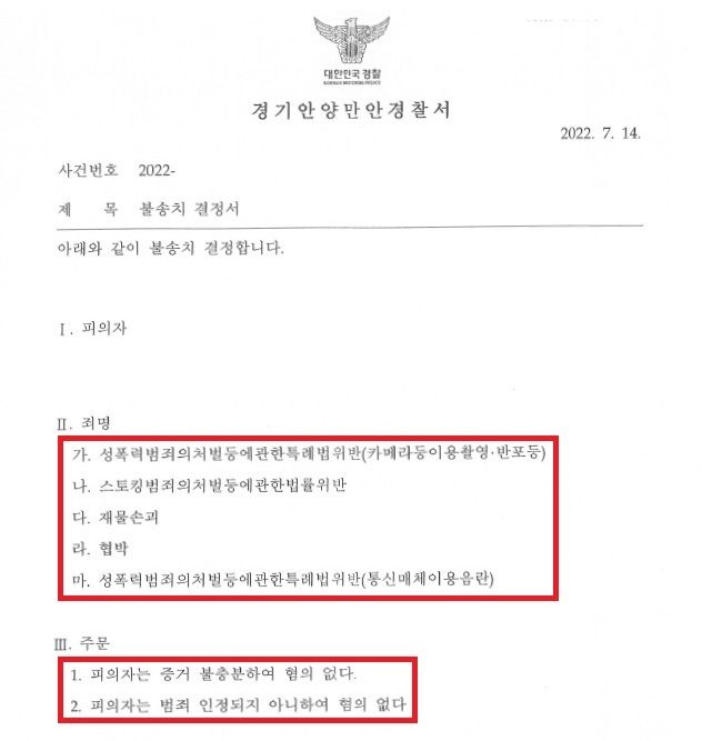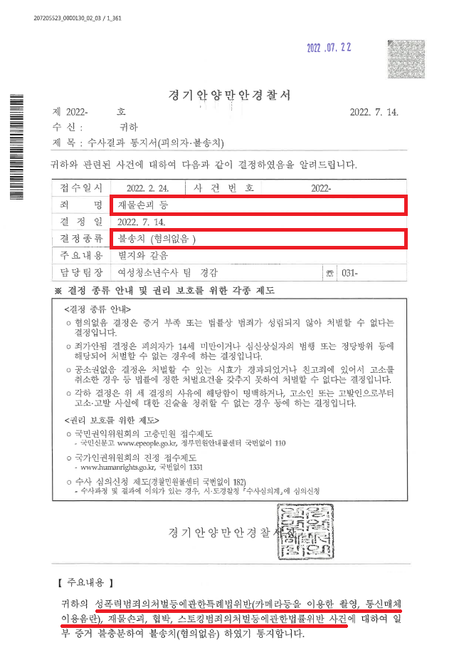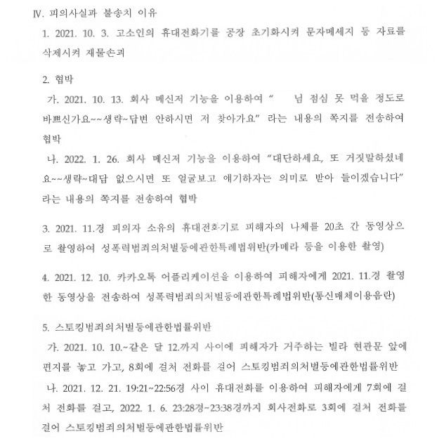 ⑥ 이후 "재물손괴의 점은 고의가 있었다고 보기 어렵고, 협박의 점은 구체적인 해악의 고지가 없었으며, 성폭력범죄의처벌등에관한특례법위반(카메라등이용촬영)의 점은 피해자의 묵시적 동의가 있었고, 성폭력범죄의처벌등에관한특례법위반(통신매체이용음란)의 점 역시 교제 기간에 이루어진 일로서 피해자의 묵시적 동의가 있었으며, 스토킹범죄의처벌등에관한법률위반의 점은 피해자가 명시적으로 전화를 걸거나 문자메시지를 보내지 말라는 의사표시를 한 사실이 없어 스토킹행위로 볼 수 없으므로, 각 죄는 모두 성립하지 않는다."라는 내용의 변호인의견서를 작성하여 제출하였습니다.