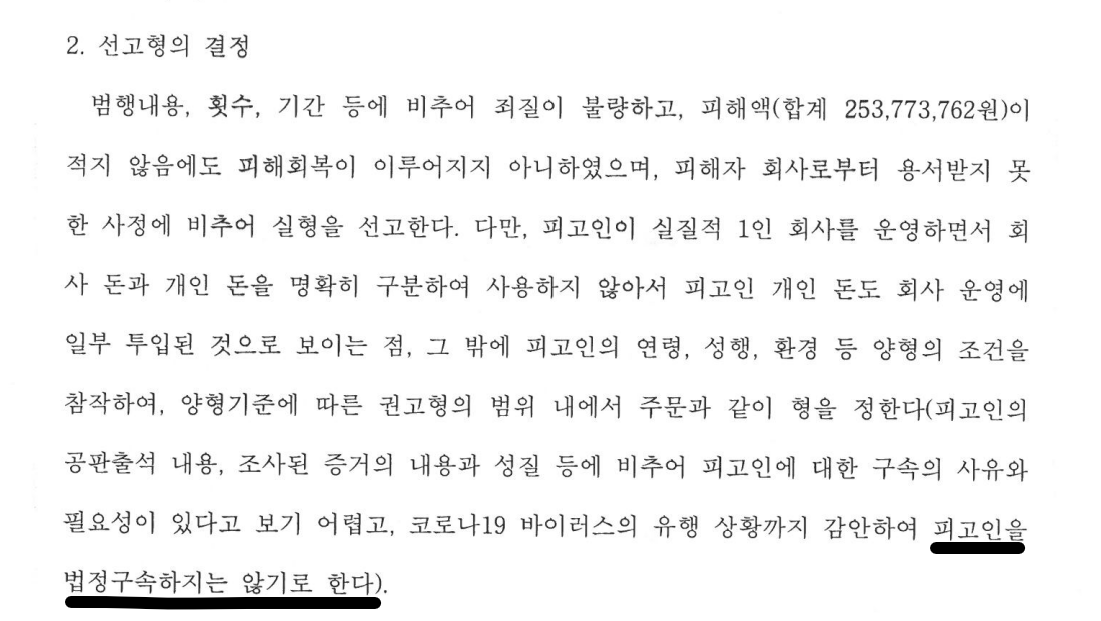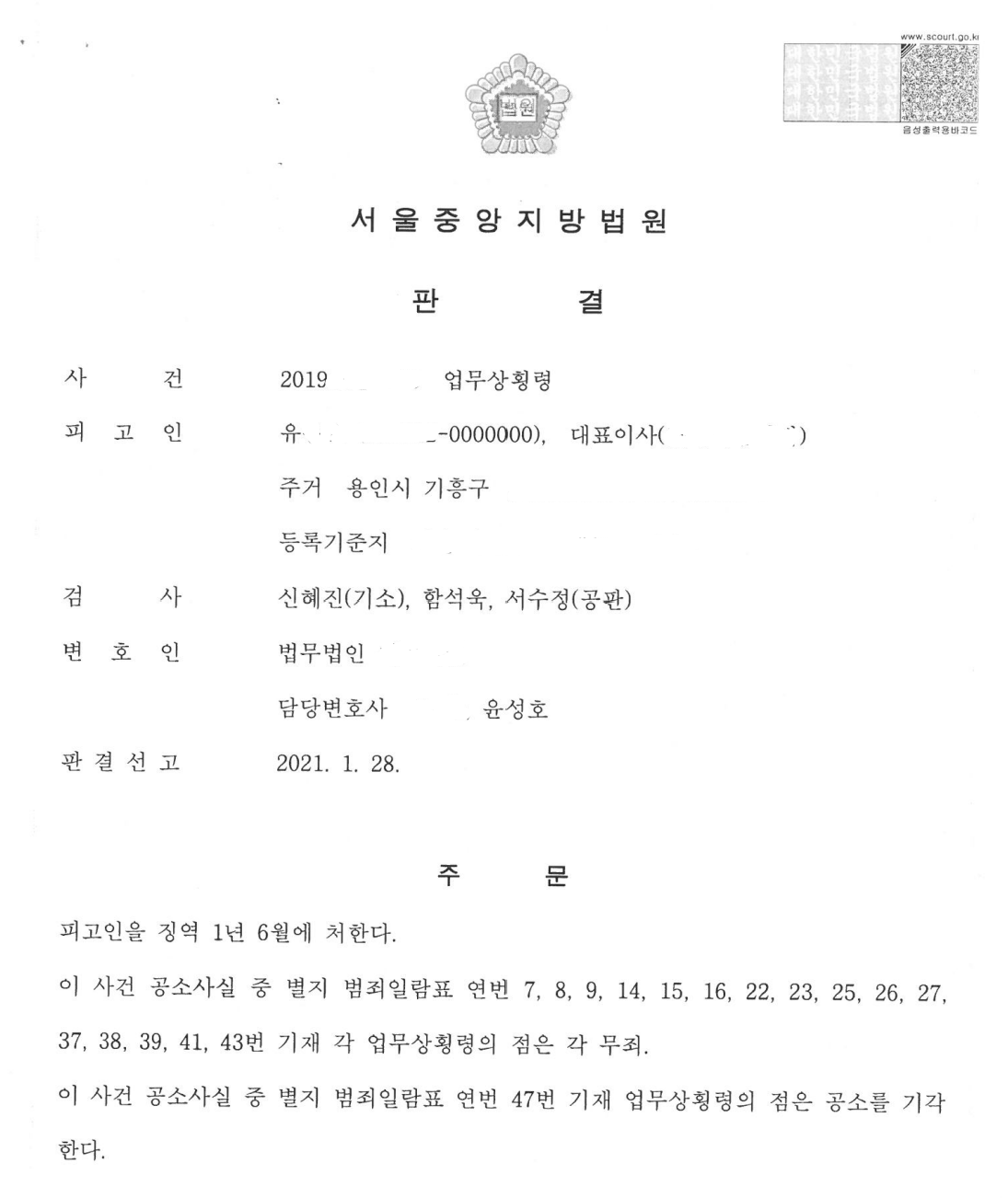 위와 같은 변호인의 적극적인 지출 내역 소명에 의거 검사는 자발적으로 횡령금액을 2억 8,000여만 원으로 줄였고, 법원도 추가적으로 약 3,600여만 원 업무상 횡령 혐의에 대해서 무죄를 선고하였습니다.