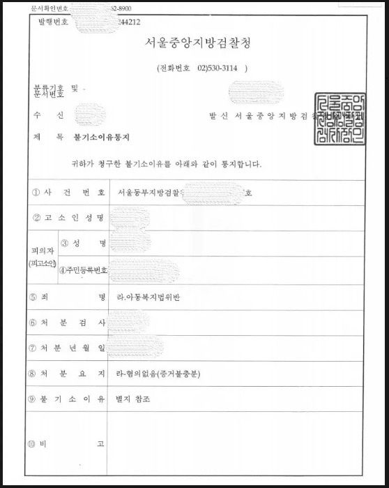 위 내용을 근거로, A 씨는 아동복지법위반 혐의에 대해 불기소(혐의없음) 처분을 받았습니다.