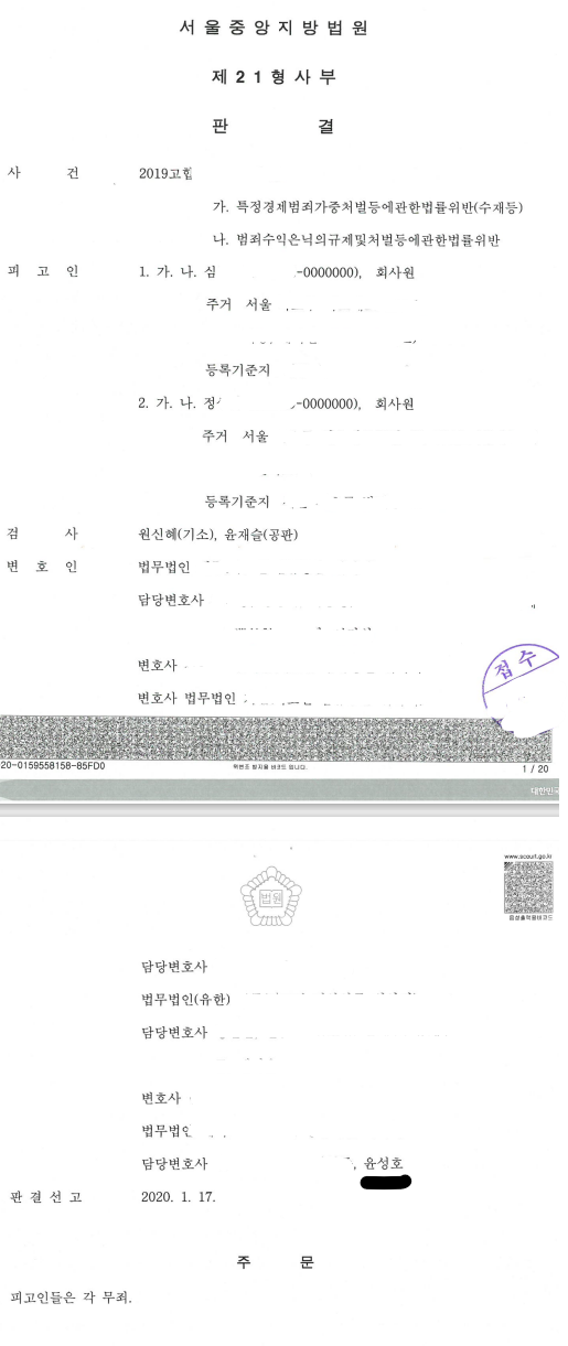 위와 같은 윤성호 변호사의 적극적인 주장·입증에 의거 재판부는 특정경제범죄법(수재) 등 위반과 관련해 무죄를 선고하였습니다. 금융회사 임직원이 차명계좌를 사용해 5억 원이나 되는 큰 돈을 지급받았음에도 무죄가 선고된 매우 이례적인 사안입니다.