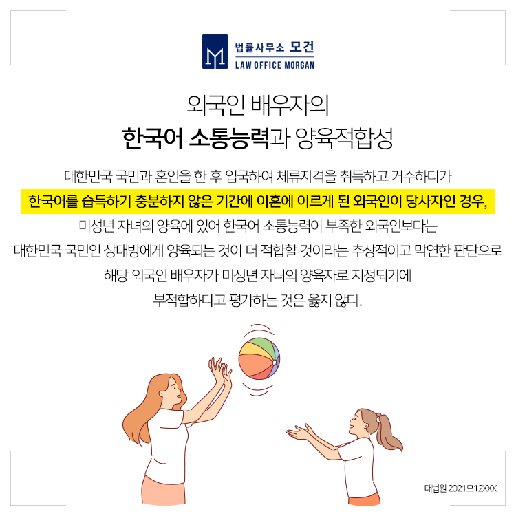 이들의 이혼소송은 대법원까지 이어졌는데, 대법원은 친권자 및 양육자로 B씨를 지정한 원심판결을 파기하였습니다. 한국어를 습득하기 충분하지 않은 기간에 이혼에 이르게 된 외국인 배우자의 상황을 고려할 때, 한국어 소통능력이 부족한 외국인보다는 대한민국 국민인 상대방에게 양육되는 것이 더 적합할 것이라는 추상적이고 막연한 판단으로 외국인 배우자가 미성년 자녀의 양육자로 지정되기에 부적합하다고 평가하는 것은 옳지않다고 본 것입니다.