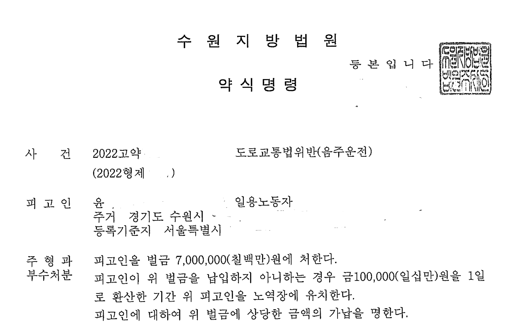 위와 같은 윤성호 변호사의 적극적인 주장·입증에 따라 검사는 벌금 700만 원 약식기소를 하였고, 의뢰인께서는 세번째 음주운전(삼진)이었음에도 실형 대신 벌금 700만 원만 선고받게 되었습니다.