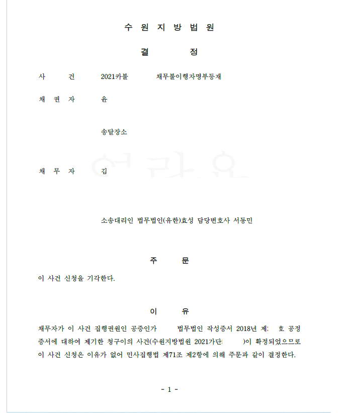 의뢰인은 수년 전 채권자에게 돈을 빌리고 공증을 썼는데 채무를 다 변제한 것으로 알고 신경 안 쓰고 살고 있었습니다. 그런데 채권자는 의뢰인이 채무를 다 변제하지 않았다면서 갑자기 공증을 가지고 채무불이행자명부등재신청을 하였고 의뢰인은 급하게 저에게 의뢰하였습니다.