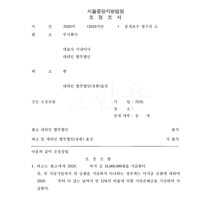 저는 조정을 유도한 후 원고의 청구액을 1/2 이상 감액한 조정안을 유도하여 조정이 성립하여 분쟁이 종료되었습니다.