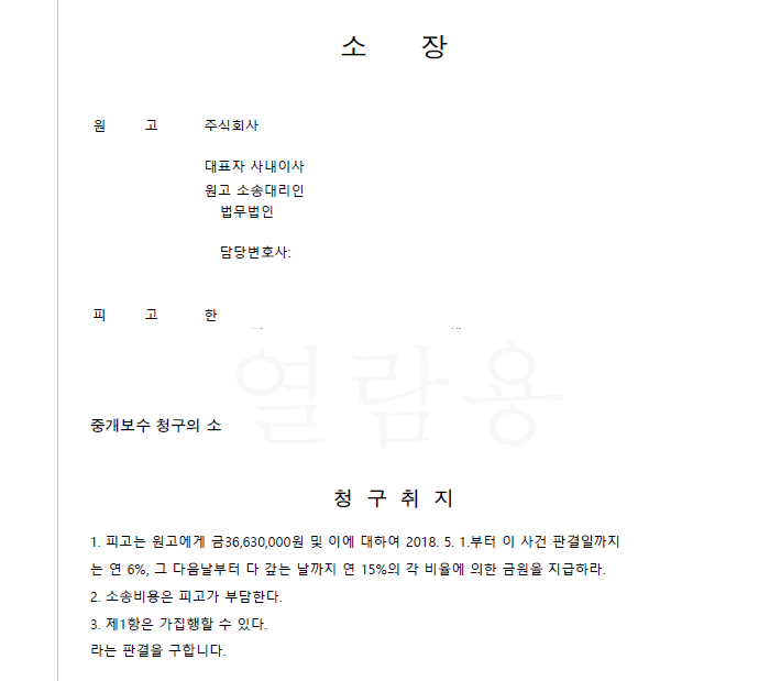 의뢰인은 원고의 중개보수청구소송의 피고가 된 후 저를 찾아오셨는데