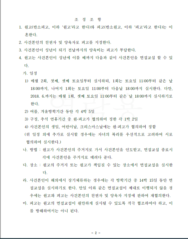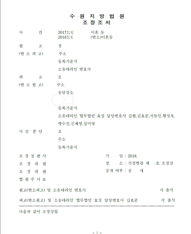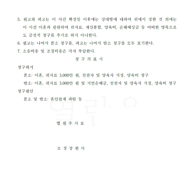 저는 즉각 응소하여 답변서 및 준비서면을 제출하고 반소를 제기하였으며 법원은 저희의 주장을 모두 받아들여 가. 아이의 친권 및 양육권은 의뢰인이 갖고, 나. 아내의 위자료 청구를 기각하며, 다. 아내는 이후 그 어떤 청구를 의뢰인에게 하지 않는 내용의 조정을 성립하였습니다.