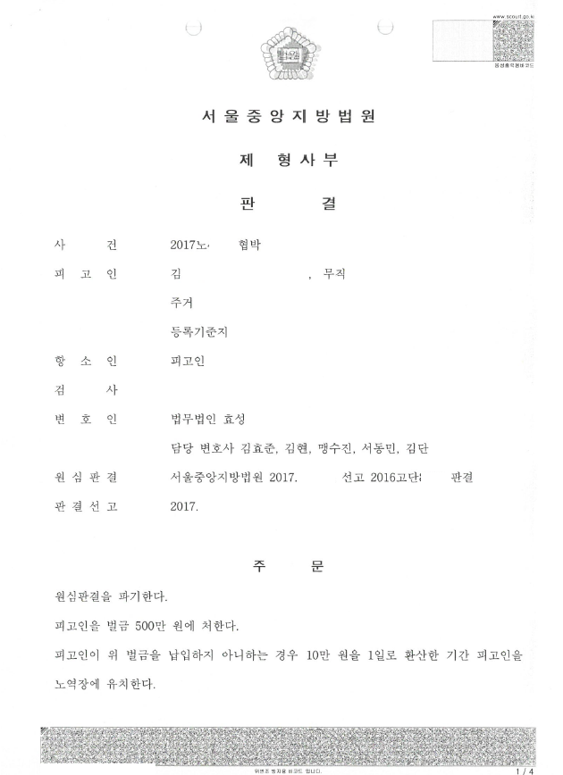 저는 의뢰를 받고 즉시 항소한 후 항소심에서 이 사건의 경위, 실제 해악을 가하지 않은 점, 피고인의 여러 사정 등을 종합적으로 변호하면서 동시에 피해자와 합의를 이끌어내었습니다. 결국 항소심에서 벌금형이 선고되었고 의뢰인은 석방되었습니다.