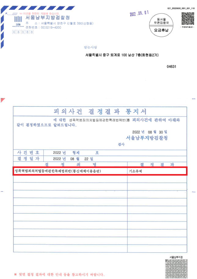 이러한 저의 조력을 바탕으로 A씨는 B씨와 합의하지 않고 혐의를 적극 다투었음에도 불구하고 아무 조건도 없는 '기소유예' 처분을 받음으로써 법적 불이익을 최소화하면서 성범죄 전과자가 될 위기에서 벗어날 수 있었습니다.
