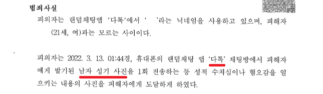 A씨는 2022. 3. 13. 01:44경 여느 때와 마찬가지로 '다톡'을 하던 중 전혀 모르는 여성 B씨에게 다짜고짜 성기 사진을 전송하였습니다.